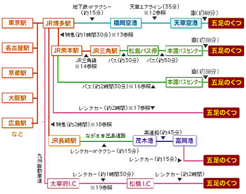 ※18 | JR長崎駅をご利用の場合は、博多駅から特急「かもめ」で長崎駅へ(所要時間約2時間)。JR長崎駅からはレンタカーかタクシーでながさき出島道路を経由して茂木港まで約15分、安田産業汽船で富岡港へ(所要時間約45分)。富岡港まではレンタカーもしくはタクシーをご利用ください。レンタカーの場合は五足のくつまで約15分です。(苓北観光汽船 http://www.reihoku-kisen.jp) |
