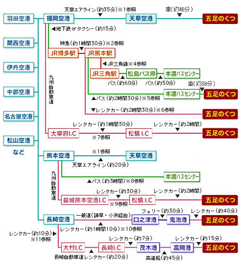 | ※11 | 長崎空港から茂木港をご利用の場合はレンタカーで大村インターから長崎自動車道へ入り長崎インターまで約20分。長崎インターから国道324号線を経由して約7分で茂木港。苓北観光汽船で富岡港へ(所要時間約45分)。鬼池港からレンタカーで約15分。 |
