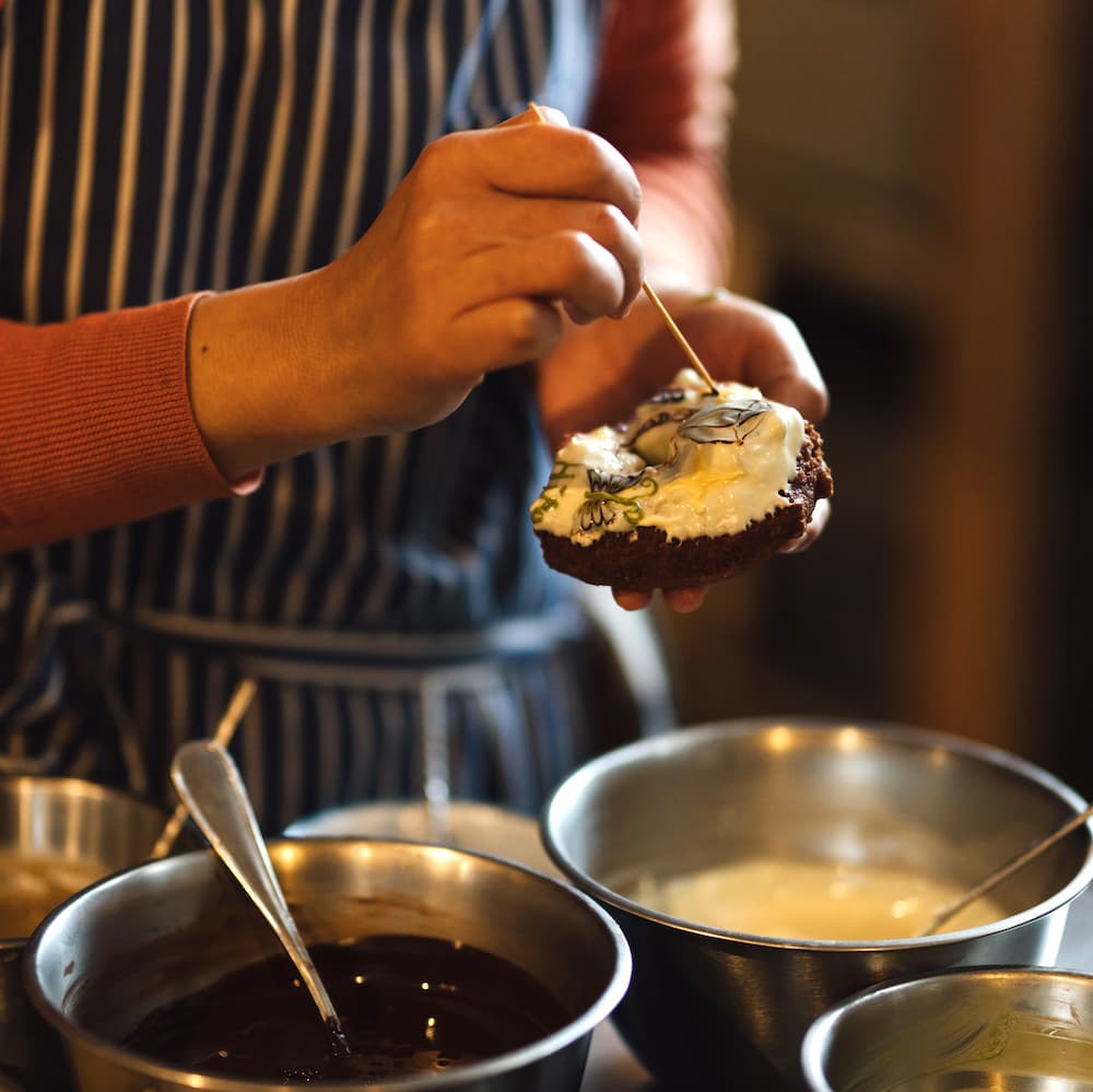 ◎写真上左 / 記念日、誕生日、還暦のお祝いなど、お客様のリクエストに合わせてデコレート。チョコレートの色も花や植物など天然由来のもの