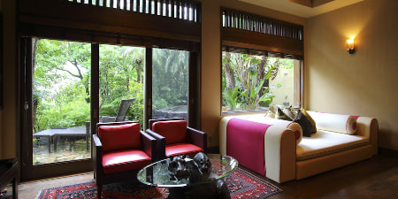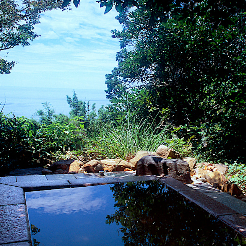 風通しのいい2階のバルコニーから吹く潮風、六角形の露天風呂の周囲を彩る緑が心と身体をリラックスさせてくれる理想的なプライベート空間です。レストランに一番近いお部屋ですので、広い敷地内での移動が少なく便利です。