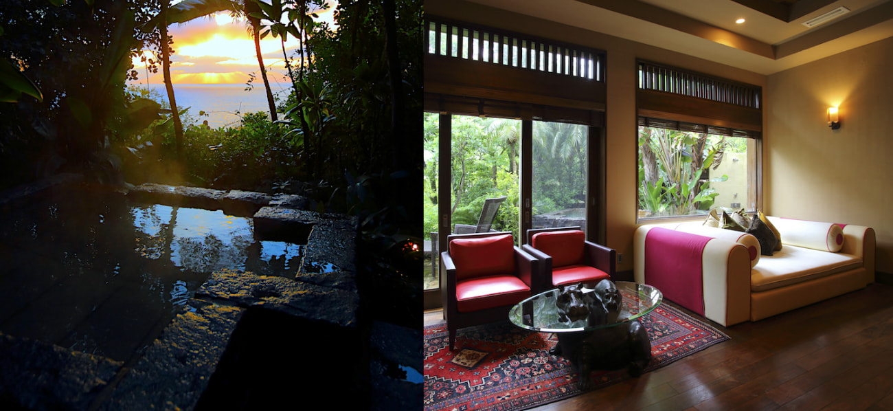うっそうと茂る樹木が屋根替わりの東シナ海を望む露天風呂、木の温もりあふれるヒノキの内風呂。六角形屋根のリビング、真っ赤なクッション。丸窓から見える紅葉、縁側に出ると聞こえる虫の声。寝室は和の情緒いっぱいの和室にお布団を敷いて…きっといい夢が見られることでしょう。