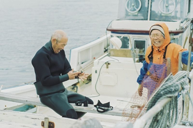 伊勢では海女=女性が潜りますが、天草では男性が潜ります。イルカが暮らす通詞島付近は漁場が深いため、夫婦で船に乗り込み、お母さんが命綱を握り、お父さんが素潜りで潜ります。富岡沖の海では港から泳いで漁場へ向かいます。いずれも素潜りです。命をかけて海へ、岩礁に棲むウニを手づかみで獲ってきてくれます。