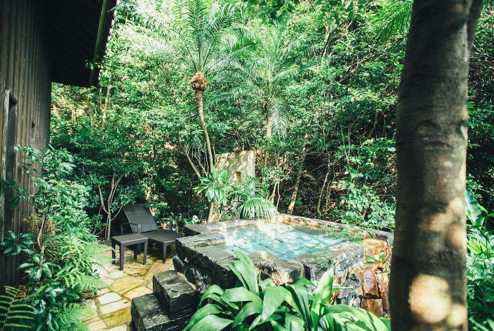 うっそうと茂る樹木が屋根替わりの東シナ海を望む露天風呂、木の温もりあふれるヒノキの内風呂。六角形屋根のリビング、真っ赤なクッション。丸窓から見える紅葉、縁側に出ると聞こえる虫の声。寝室は和の情緒いっぱいの和室にお布団を敷いて…きっといい夢が見られることでしょう。