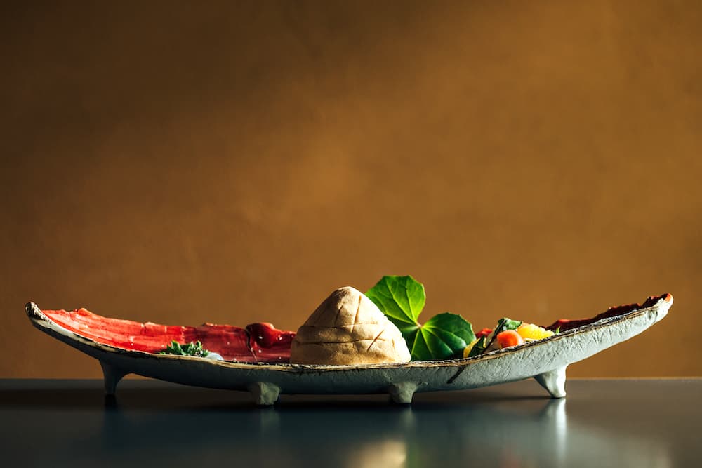 天草黒牛(もしくは地鶏・天草大王)を包んだ塩釜を石山に見立て、盛り付けます。