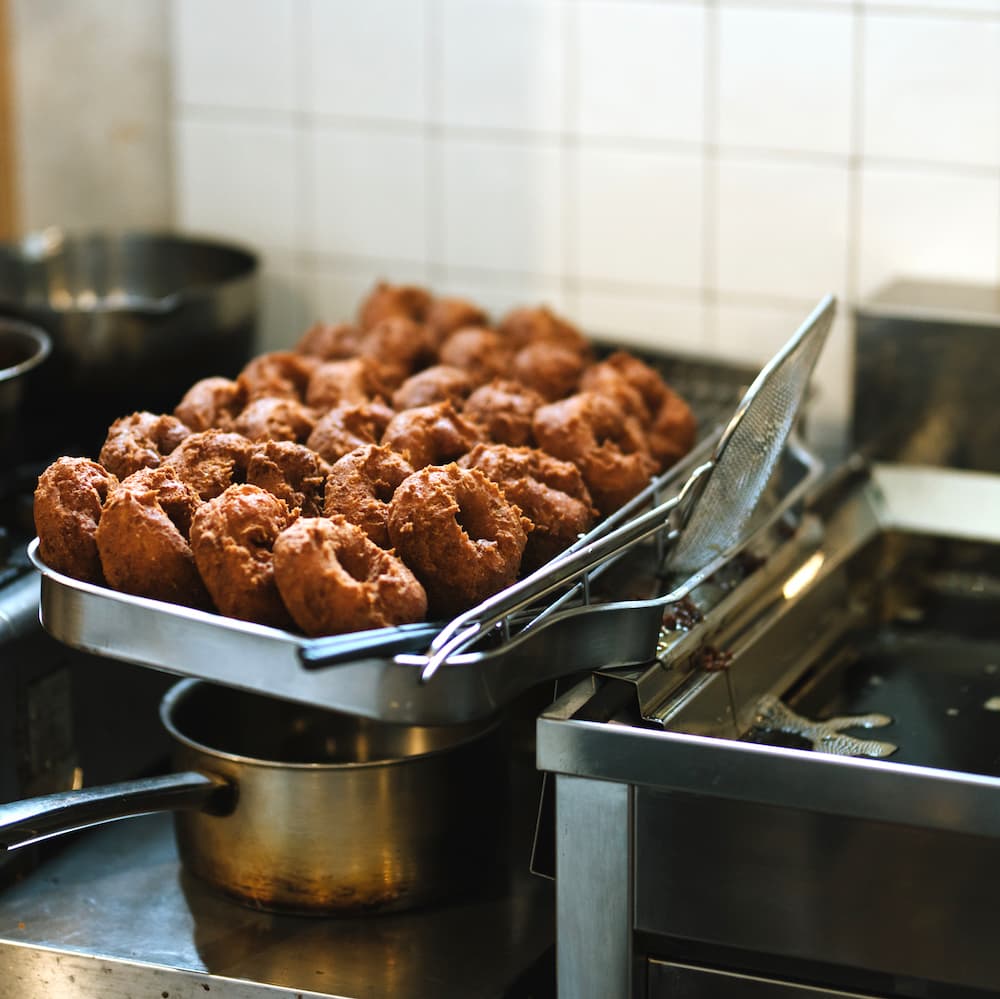 ◎圧搾法で絞られた太白ごま油、米ぬかで絞られた米油を使用。「ウォーターフライヤー」でヘルシーに揚げています