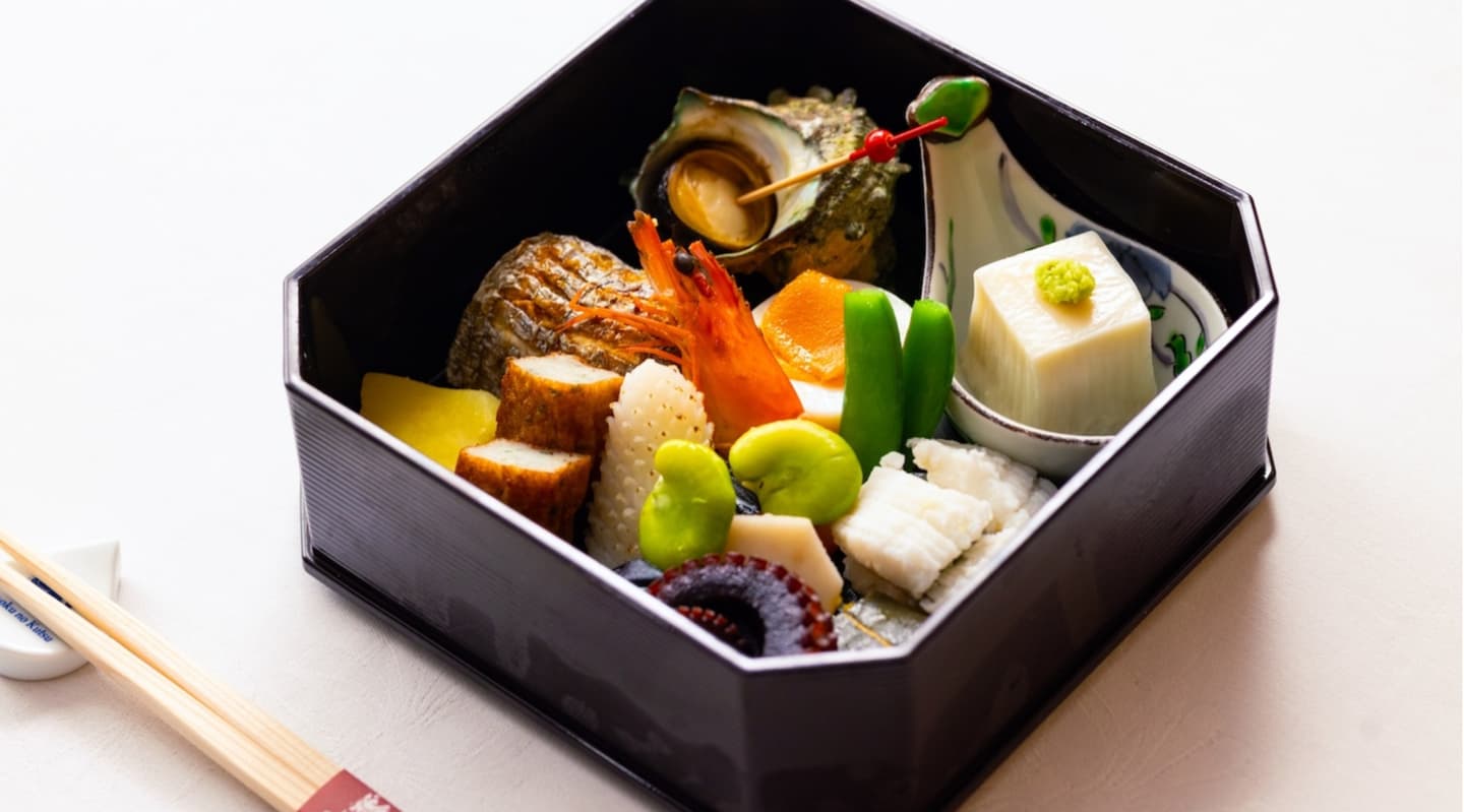 重箱スタイルは、季節のお料理とお造りの盛り合わせを二段重ねの重箱に詰めて、