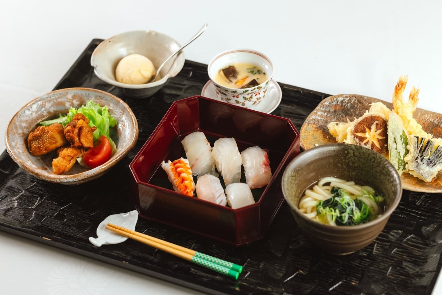 ほかに海老と野菜の天ぷら、鶏のから揚げ、茶碗蒸し、