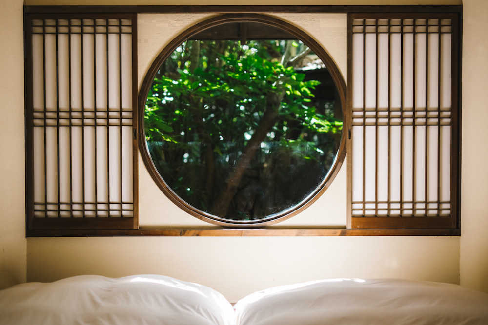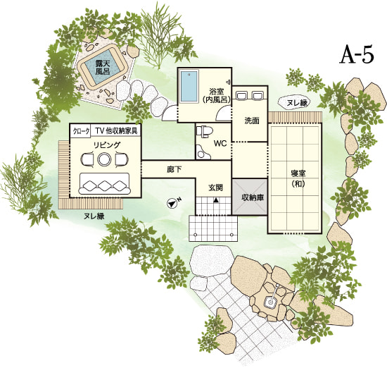 うっそうと茂る樹木が屋根替わりの東シナ海を望む露天風呂、木の温もりあふれるヒバの内風呂。六角形屋根のリビング、真っ赤なクッション。丸窓から見える紅葉、縁側に出ると聞こえる虫の声。この部屋でくり広げられるストーリー。五足のくつの醍醐味を味わってください。