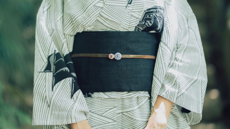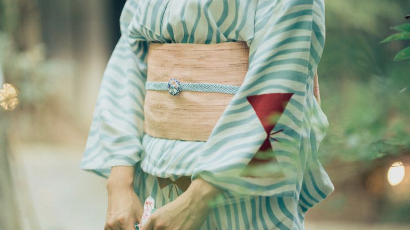 帯は、麻きびら。チェックと同色の麻色を使うことで、個性的なゆかたを落ち着いた雰囲気にまとめてみました。天草ボタンを帯留めにして仕上げます。