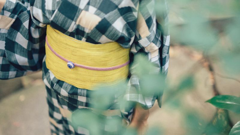 帯は、麻きびら。チェックと同色の麻色を使うことで、