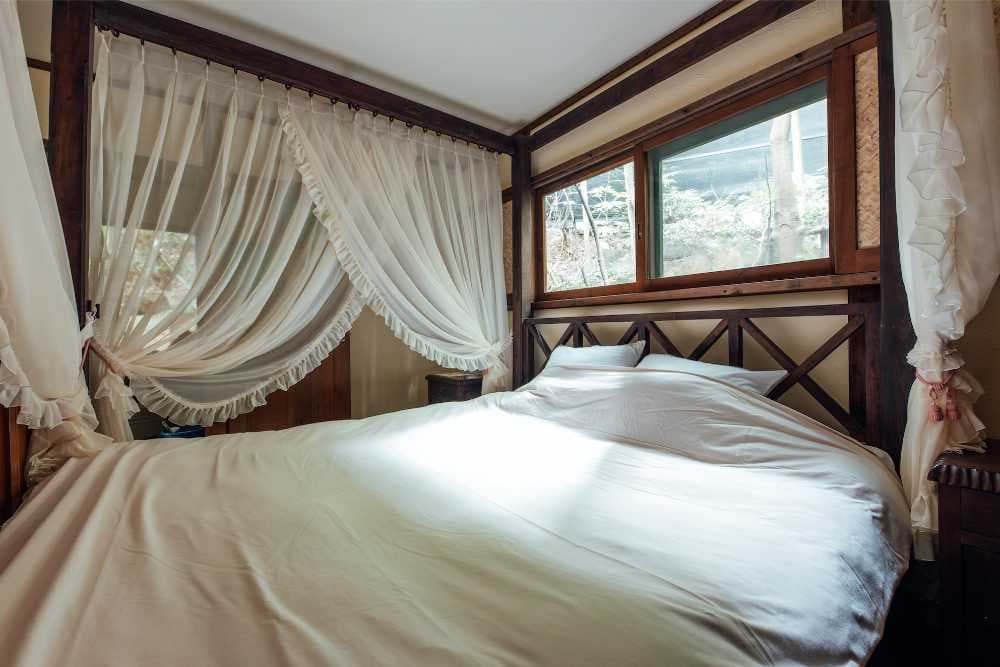 お部屋は洋室のワンルームタイプでキングサイズのベッドがございます。ぜひベッドの上の小窓を開けてお休みください。