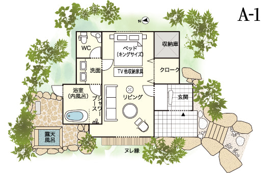 紅葉の木々が屋根替わり、岩造りの大きな露天風呂があるお部屋です。