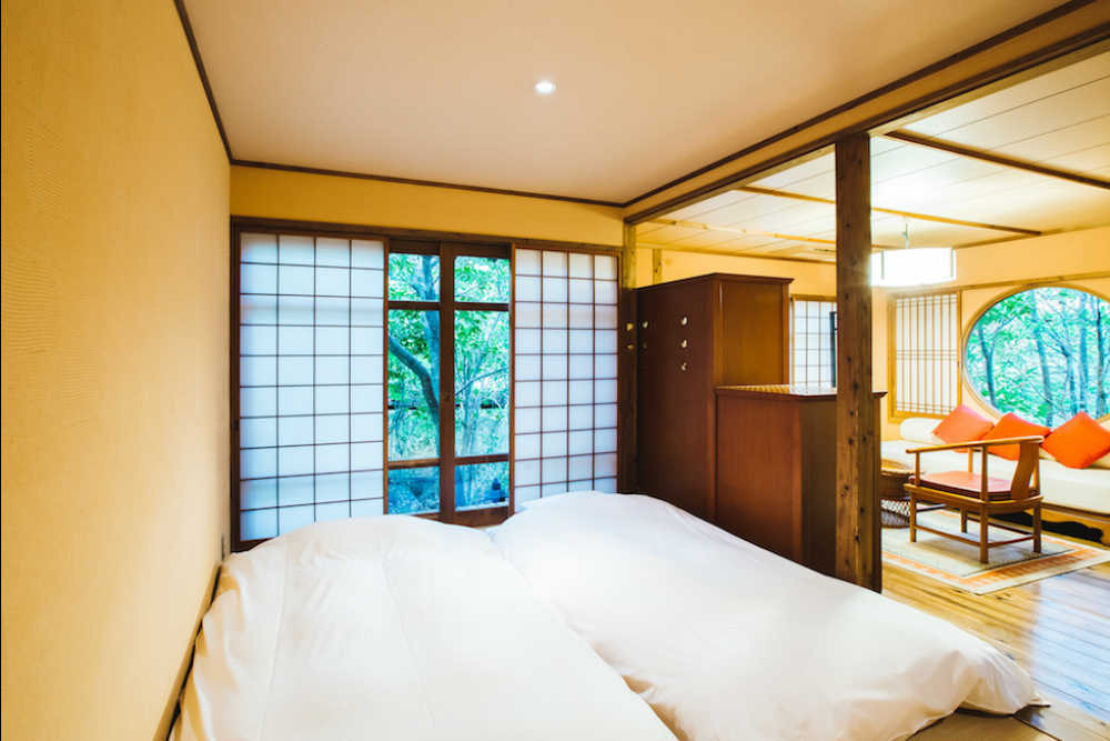 海と共に暮らしてきた天草の歴史「OLD天草」をテーマにしました。天草の漁師町を思わせる、緑に囲まれた素朴な空間が広がります。障子を開けると縁側がある、どこか懐かしさをも感じさせる造り。緑がしっとりと濡れる雨の日は幻想的な風景に。雨が似合う部屋です。