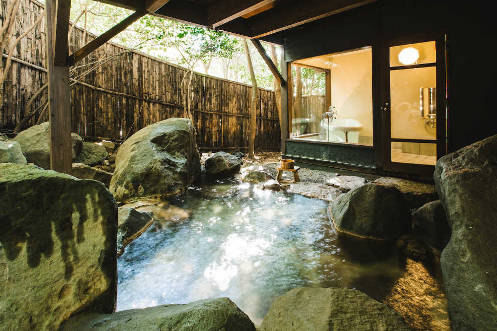 客室は離れの4棟で、各部屋に露天風呂(天然温泉)と内湯がございます。ワンルームタイプ、和洋室の二間、2階建てと、デザインはすべて異なります。旅のスタイルに合わせ、お好みの客室をお選びください。